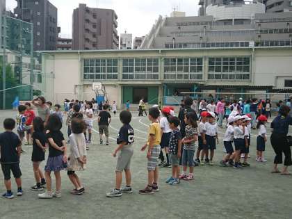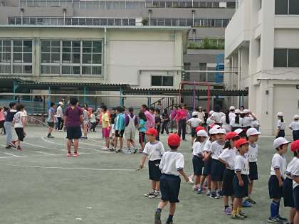 中休みになると全校児童が校庭に出て、教員とともにクラスごとに長縄跳びに取り組みます。