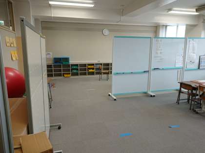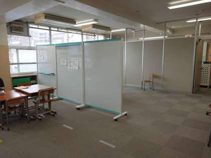 部屋の中は広々としていて、パーテーションで仕切られています。床はカーペット敷きで、棚には様々な教材が置かれています。
