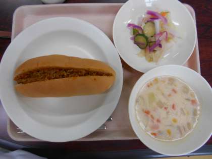 本日の給食は、ドライカレーサンド・コーンクリームスープ・フレンチサラダ・牛乳です。