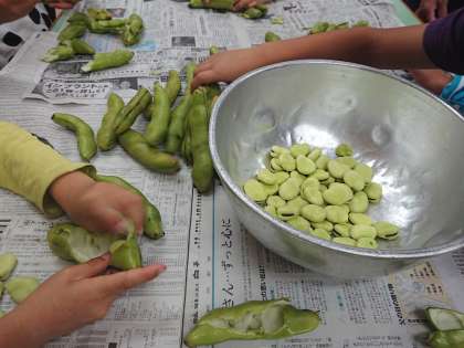 始めに栄養士の説明を聞いて、そのあとグループごとにたくさんのそら豆のさやをねじって豆を取り出しました。