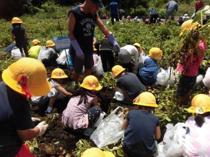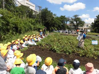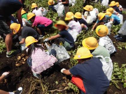 1年1組・2組・わかば学級がバスで秋山農園まで、じゃがいも掘りに行きました。「うんとこしょ! どっこいしょ!!」じゃがいもがたくさん採れました。今日のおやつはじゃがバター?