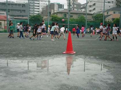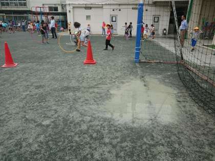 中休みに子どもたちは、水溜まりを避けて元気に遊んでいました。