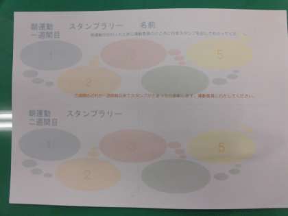 本日より7月13日(金)までの3週間、運動委員会児童が企画した「朝運動」を実施します。1週目はラジオ体操、2週目は長なわ跳び、3週目は短なわを使ったリズムなわ跳びです。今朝は暑い中でしたが、60名ほどの児童が参加し、気持ちのよい汗を流していました。参加児童は、6年生手作りのカードにスタンプを押してもらっていました。