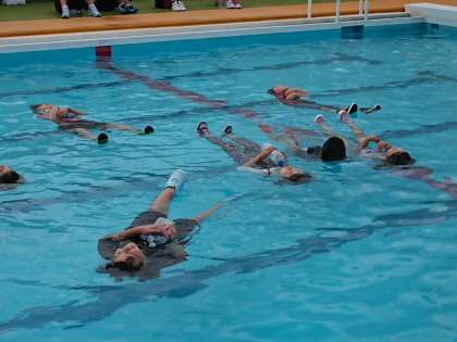 後半では、ペットボトルなど身近に浮いている物にバランスよくつかまって浮く練習をしました。