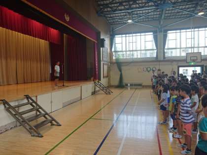 校長の話は短く済ませ、続いて児童代表の言葉がありました。代表の5年生2人は、マイクを通して1学期に頑張ったことやこれからのめあてなどを堂々と話していました。