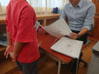 なんと、受け取った通知表は置いたまま、どの子もお絵描きや折り紙に夢中でした。さすが1年生です。
