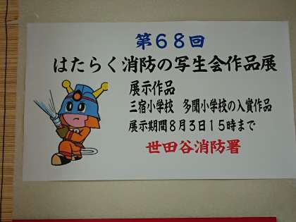 第68回はたらく消防の写生会の作品展が、池尻まちづくりセンターで開催されています。三宿小からは、入賞した1、2年生6名の作品が展示されています。