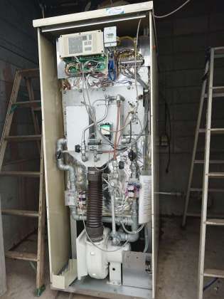 工事業者の人に聞くと、このボイラーは家庭用の給湯器と比べ、約10倍の能力があるそうです。