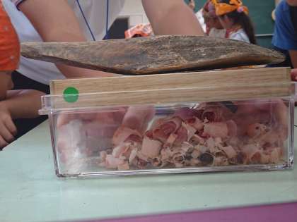 鰹節のできるまで、だしの取り方などいろいろ教えてもらいましたが、子どもたちが一番真剣に取り組んでいたのは、鰹節削りの体験でした。これは保護者でも未経験の方が多いのではないでしょうか。