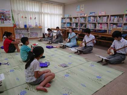 バチの持ち方から始まり、簡単な演奏をするまでを、三宿中から来てくれた生徒たちに手取り足取り教えてもらいました。