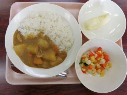 本日の給食は、チキンカレーライス・カラフルサラダ・りんご・牛乳です。