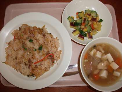 本日の給食は、キムタクごはん・冬瓜汁・ころころさつまいもサラダ・牛乳です。