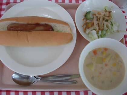 本日の給食は、ウインナーサンド・クリームシチュー・ゴボウチップサラダ・牛乳です。