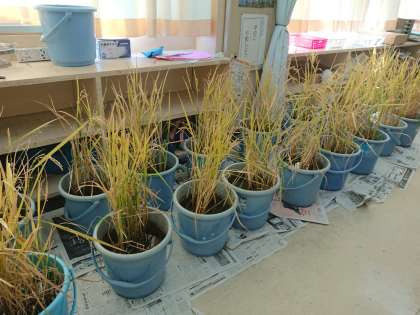 その5年生は、台風に備えてバケツ稲を教室の中に移していました。