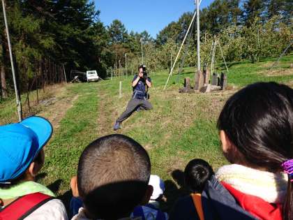 はじめのうちは村の中を歩き、りんご農園の中でクラスごとの集合写真を撮りました。りんご畑の周りは柵で囲まれており、夜間には電気を流すこともあるそうです。