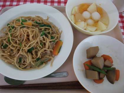 本日の給食は、塩やきそば・里芋の甘辛煮・フルーツ白玉・牛乳です。
