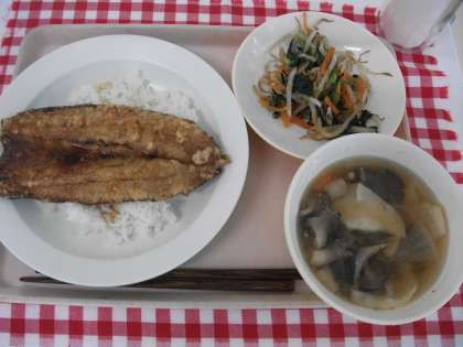 本日の給食は、さんまのかば焼き丼・青菜のおひたし・せんべい汁・牛乳です。