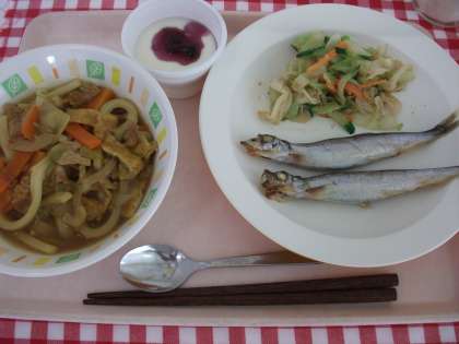 本日の給食は、カレーうどん・焼きししゃも・やさいのごまあえ・パンナコッタ・牛乳です。
