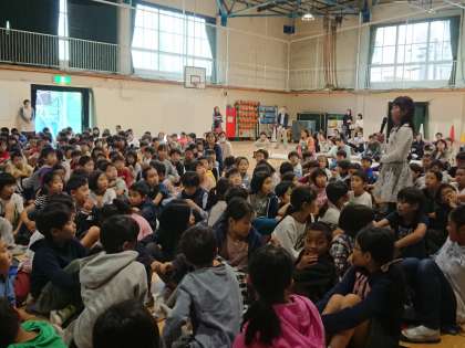 子どもたちにはスクリーンで絵本の中身を紹介しながら、本校の図書館司書がマイクを使って読み聞かせをしました。
