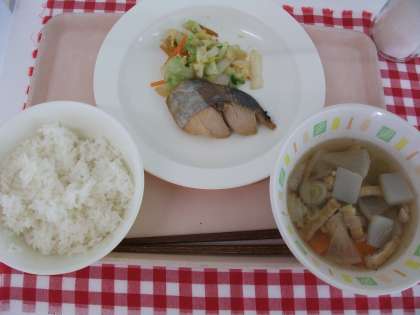 本日の給食は、ごはん・魚の西京焼き・白菜のゆず風味・けんちん汁・牛乳です。