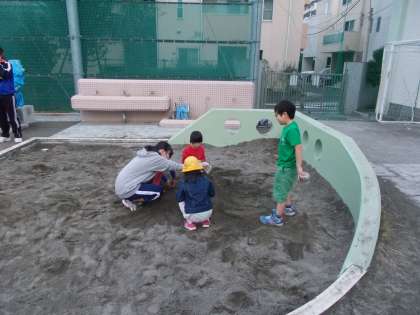 砂場遊びも前回の「火山」作り以来掘りやすくなりました。