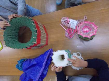 お箸を11本取り付けて、極太の毛糸で編んでいきます。