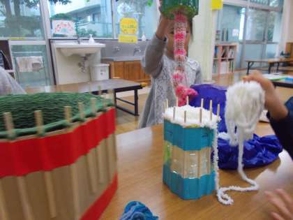段ボールや細めの筒を使ったりしている児童もいました。