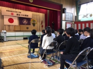 午前の110周年記念式典では、世田谷区教育委員会教育長の堀恵子様をはじめ多数のご来賓をお招きし、在校生代表として4、5、6年生が参加しました。1、2、3年生は朝の記念朝会に参加しました。