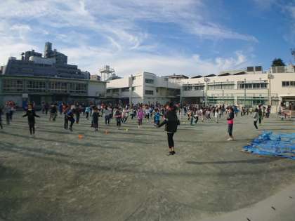 全校の児童が中休みに校庭に出て短なわ跳びを行います。普段あまりなわ跳びをしない児童も、みんなと一緒なら、進んで取り組めることでしょう。