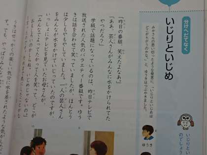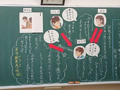 教科書に載っている教材は「いじりといじめ」。いじりといじめの違いをきっかけに、分け隔てなく相手を大切にする態度についてみんなで考えながら公正公平、社会正義にかかわる心情を育てていきます。