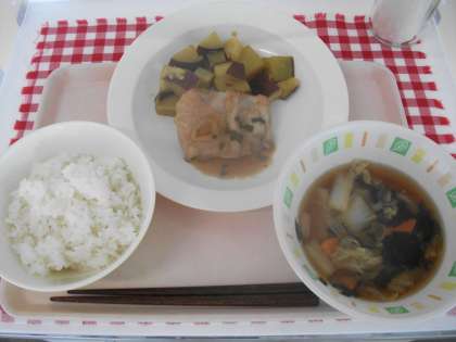 本日の給食は、ごはん・鶏肉の香味焼き・さつまいもの含め煮・白菜の味噌汁・牛乳です。