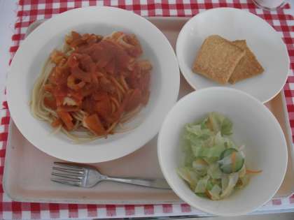 本日の給食は、スパゲティ地中海ソース・野菜のイタリアンドレッシングかけ・食パンラスク・牛乳です。