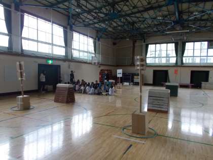的がなかなかたおれず、協力して投げていました。