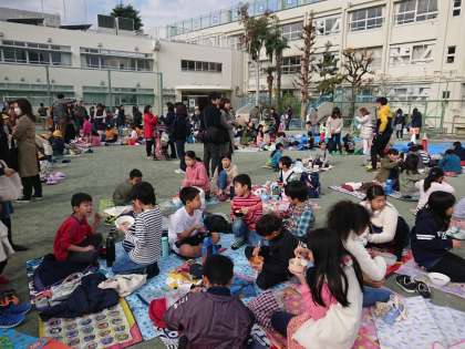 午前10時からは保護者の方々も、受付を済ませて校庭に集まりはじめ、おもちがつきあがるのを待ちました。