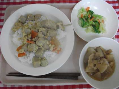 本日の給食は、高野豆腐の卵とじ丼・大根の信田煮・即席漬・牛乳です。
