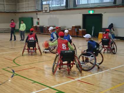 ゲーム中には、「ドリブルがうまいね」「ボールを膝の上に置いて動くといいよ」など、村上さんからマイクを通して言葉かけをしてもらっていました。子どもたちは思うように車イスを動かせず、苦労していました。でも、とても楽しそうでした。