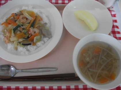 本日の給食は、八宝菜丼・もやしのと鶏肉のスープ・りんご・牛乳です。