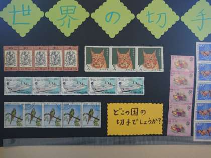 せっかくいただいた切手なので、子どもたちにも見せてあげたいと、教員が昨夜工夫して展示用の装飾を施していました。