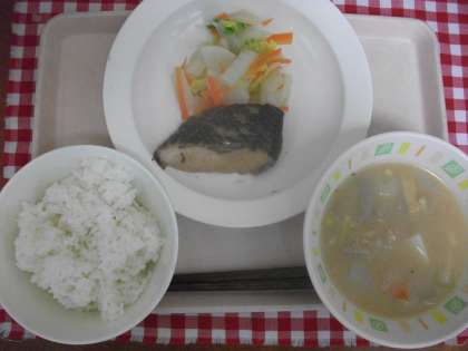 本日の給食は、ごはん・黒むつの煮つけ・野菜のゆず風味かけ・呉汁・牛乳です。