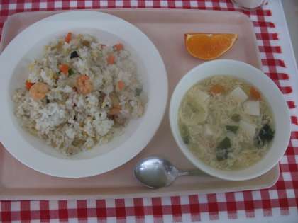本日の給食は、エビピラフ・卵とわかめのスープ・オレンジ・牛乳です。