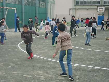 今朝は児童集会。6年生が下級生をまとめるたてわり班ごとに、「しっぽとりゲーム」をやり、みんなで体を動かしました。