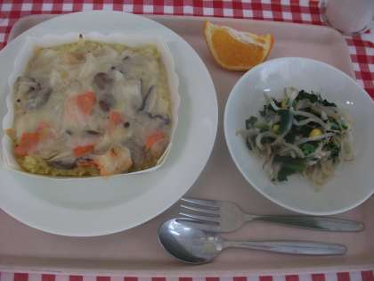 本日の給食は、きのこのドリア・もやしとほうれん草のサラダ・いよかん・牛乳です。