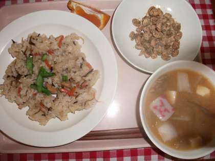 本日の給食は、磯おこわ・いわしのつみれ汁・きなこ大豆・デコポン・牛乳です。