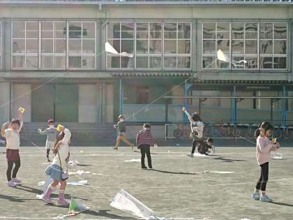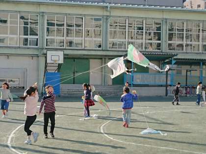 2時間目になると、1年生が2クラスとも校庭に出て、凧上げをしていました。