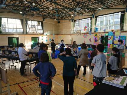 今週の月曜日には、児童が下校した後に、全教員が体育館に集まり、平面作品の展示作業を行いました。
