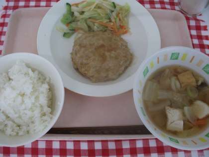 本日の給食は、ごはん・つくねバーグ・糸寒天サラダ・具だくさん味噌汁・牛乳です。