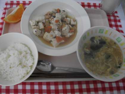 本日の給食は、ごはん・豆腐の五目炒め・中華風コーンスープ・清美オレンジ・牛乳です。