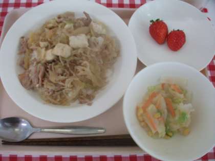 本日の給食は、すきやき丼・白菜のサラダ・いちご・牛乳です。