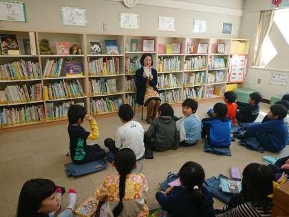 午前に図書室を覗いてみると、2年生がちょうど読み聞かせをしていました。読んでいるのは本校の図書館司書です。今日は日本の昔ばなしがテーマでした。