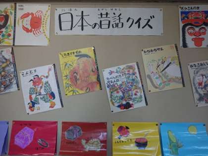 図書室前の廊下には、ちょうど「日本の昔話」の掲示物が飾られていました。